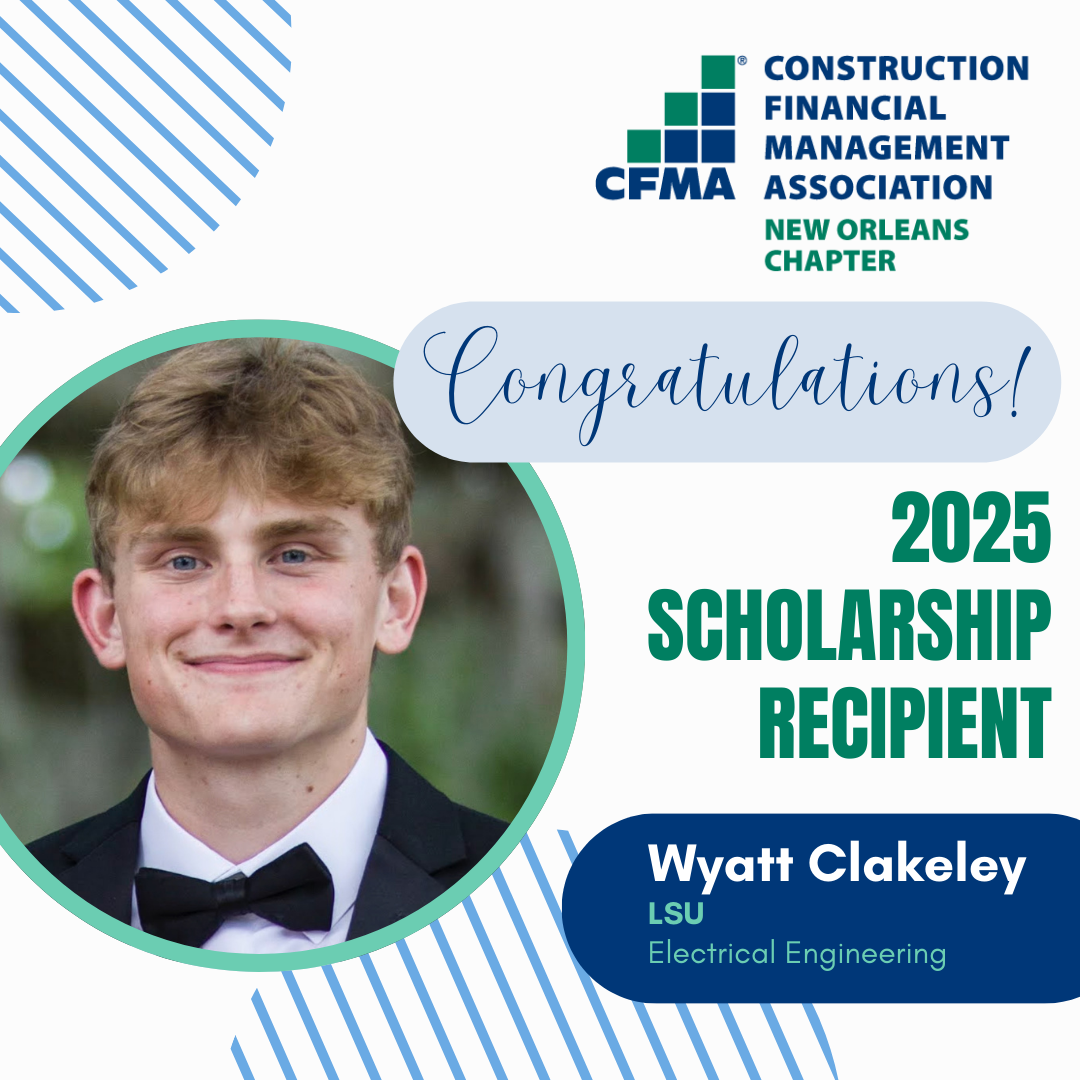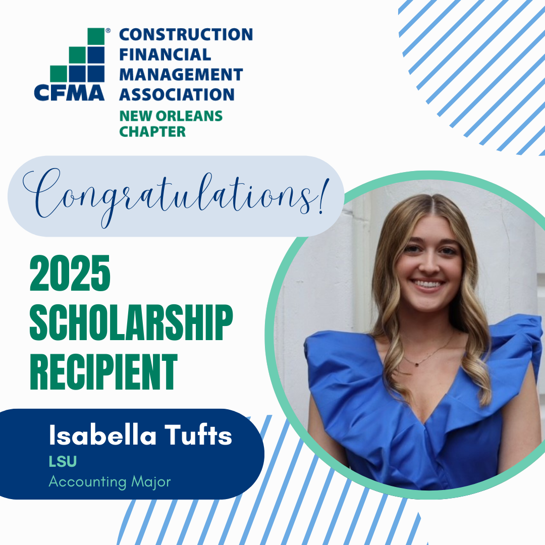 2025 SCHOLARSHIP PROGRAM The CFMA Greater New Orleans Chapter has established a scholarship program to assist CFMA members, their sons and daughters and CFMA member co-workers (including co-op students who are employed by January 1st of each year) who are pursuing an undergraduate degree in the field of Accounting or Finance, Engineering, Architecture or Project Management. It is required that the applicant submit an application (attached), a cover letter outlining their reason for pursuing a career in the above fields, and transcripts of the students grades, Consideration will be given to students pursuing a career in the construction industry, or have been employed in the construction industry either through summer employment or cooperative education programs. These awards are intended to assist the student with the cost of tuition, and are to be used solely for this purpose, as well as an enticement for them to consider full-time employment in the industry upon graduation.